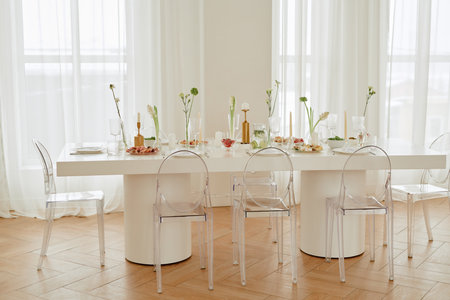Empty wedding celebration table set with plates, glasses, candles, and floral arrangements standing in bright room, transparent chairs surrounding table, no people visible