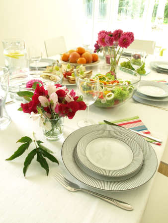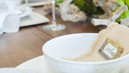 Elegant white themed casual wedding dinner with beautiful dishes and decorations