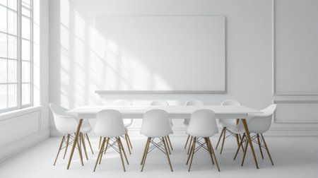 A long, white table dominates a modern boardroom, surrounded by rows of white chairs. Large windows offer a panoramic view of a cityscape, bathed in soft, natural light. The composition is clean and minimalist, suggesting a professional setting. Suitable for business presentations, corporate meetings, or interior design concepts.