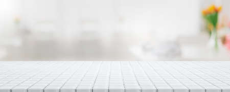 Empty white ceramic mosaic table top and blurred bokeh cafe and restaurant background with vintage filter - can used for display or montage your products.
