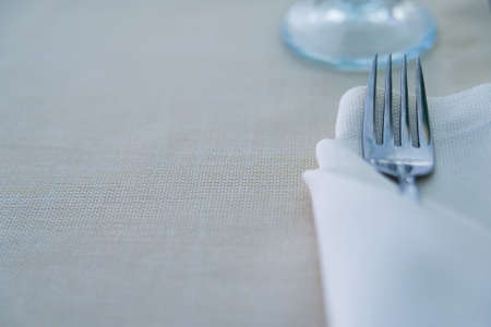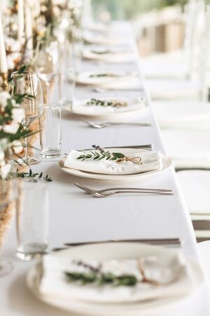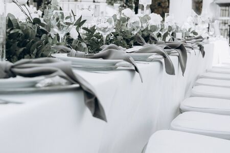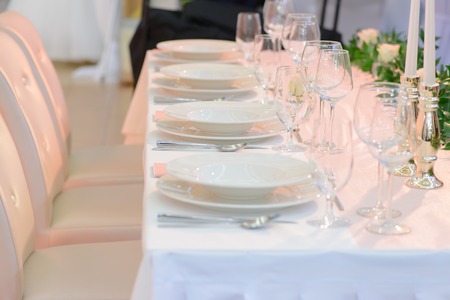 Close-up of served table in a luxury restaurant at the holiday eve. Serving dishes, glass wine glasses and gold cutlery. Concept of catering service.