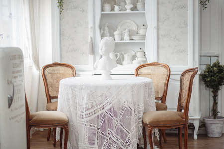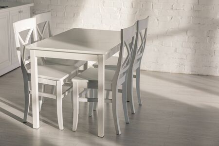 Modern kitchen white furniture with a table top made of natural stone. Advertising photography of kitchen interior. View of kitchen table corner