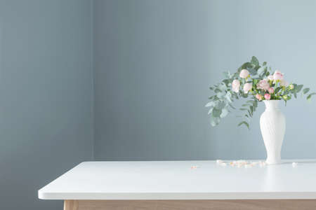 Close up view of minimal home interior design with copy space, mug, frame and ceramic vase on white table