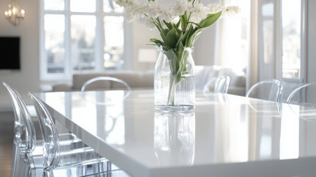 Modern dining area featuring a glass vase with flowers on a sleek white marble table