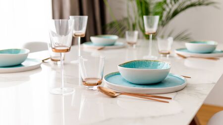 Close up new diverse of glassware and porcelain plates served on white tablecloth, no people. Table settings wait for guests at home or restaurant. Dinner party, tableware shop advertisement concept