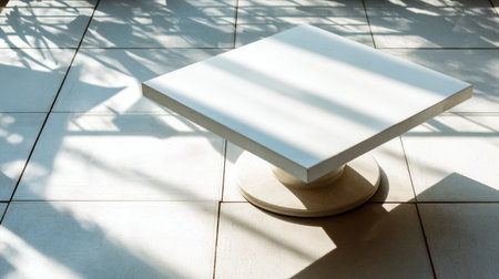 A square modern coffee table sits gracefully in a bright indoor space, surrounded by greenery. Soft shadows create a warm and inviting atmosphere, showcasing minimalism.