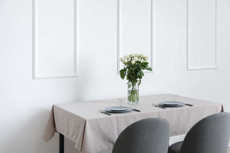 Panorama photo, a glass vase of flowers placed on wooden table with modern gray chairs, interior design of cozy dining room with light pastel wall and door