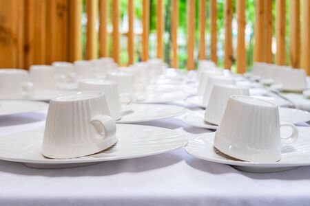 Many white round tables, celebration concept, banquet concept, conference concept, texture background, blank