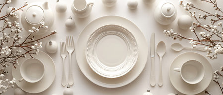 A series of simple, elegant dinnerware arranged on a plain dining table