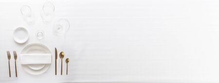 Elegant table setting with white plates, silver cutlery and glasses for festive dinner. Large image for banner