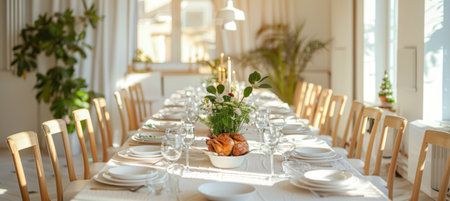 Digitally rendered image depicts a dining room. The room features white walls, a long white table set for a formal dinner, and several potted plants of various types. White wooden chairs are arranged around the table. The walls are paneled with detailed trim. The floor is a light brown wooden plank design. The lighting in the room is bright and airy.