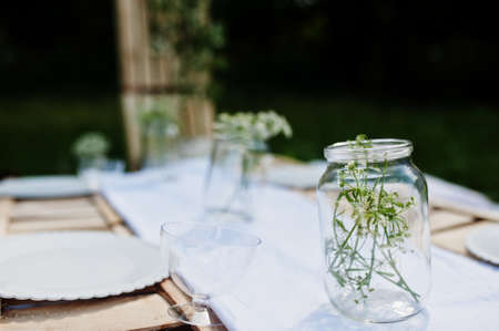 Wedding in the style rustic. Decoration of the table with flowers and cutlery. Composition from flowers.