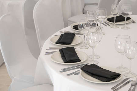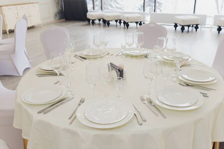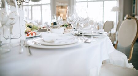 Table setting with white plates, silver cutlery and glasses on restaurant table. Dinning concept background.