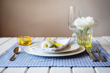 Table setting with blue checkered tablecloth, white napkin, silverware, yellow decoration and flowers