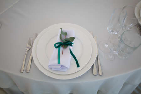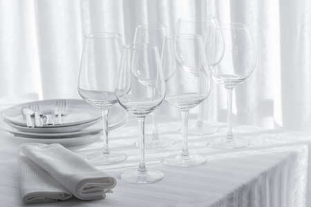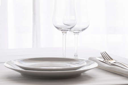 Clean plates, glasses and cutlery on white table decoration in restaurant