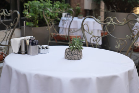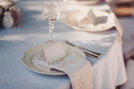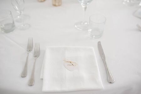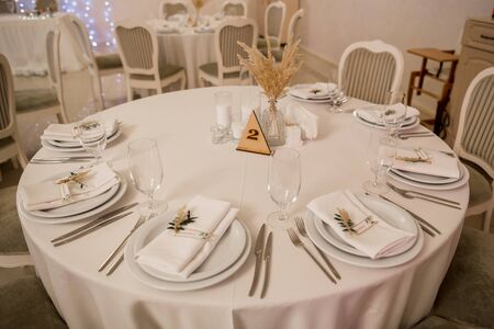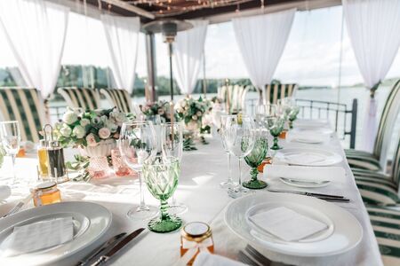Table set for wedding or another catered event dinner. Concept: Serving. Celebration. Anniversary. Wedding