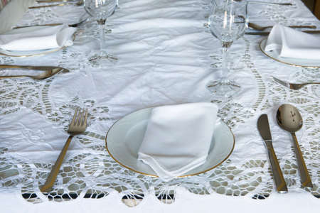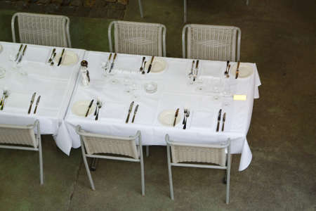 View over wedding table covered with white tablecloth with empty glasses, plates and utensils. Snacks are served on the table.