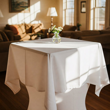Clean and minimalist. this mockup showcases a pristine white tablecloth draped over a wooden table against a neutral backdrop. Perfect for showcasing your designs or products!