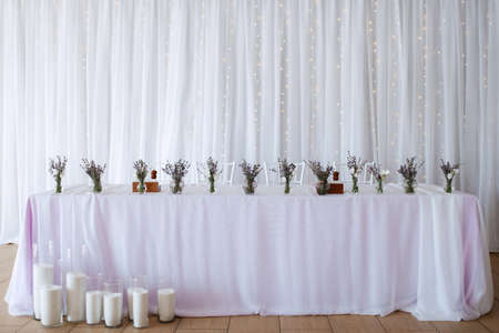 Wedding. Banquet. The chairs and table for guests, decorated with candles, served with cutlery and crockery and covered with a tablecloth. The table stands on a green lawn in the backyard banquet area