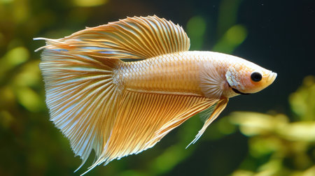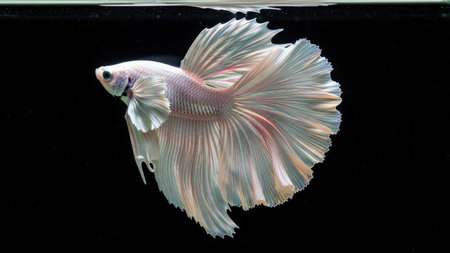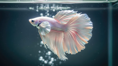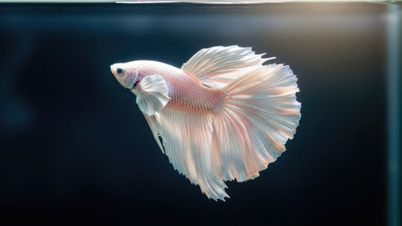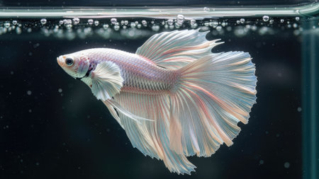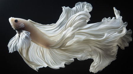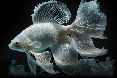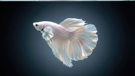 A stunning white Betta fish, also known as Siamese fighting fish, is presented against a dark, contrasting backdrop. The image highlights the fish's flowing fins and delicate scales, emphasizing its graceful form. The lighting is soft, creating a sense of depth and accentuating the textures. Suitable for various editorial and commercial applications.
