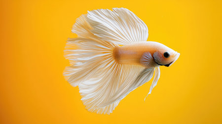 This image features a stunning Betta fish gliding gracefully with flowing fins against a bright yellow backdrop, capturing the serene beauty of aquatic life.