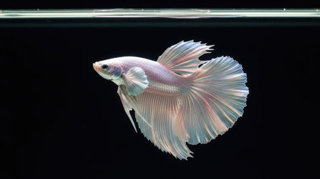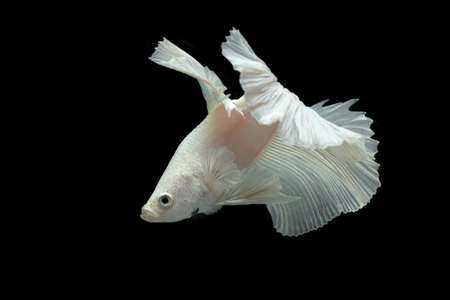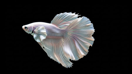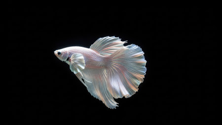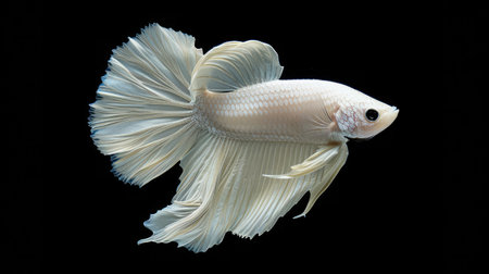 This studio photograph features a solitary white betta fish gracefully displayed against a stark black backdrop. The fish exhibits flowing fins and a pearlescent quality. This image, with its contrasting colors and sharp focus, may be suitable for diverse commercial applications and editorial purposes.