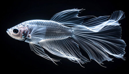 A stunning betta fish glides through the inky darkness, its translucent fins trailing like ethereal wisps of smoke. The high-contrast lighting reveals its delicate skeletal structure, creating a mesmerizing and ghostly x-ray effect that highlights the fragile beauty of aquatic life.