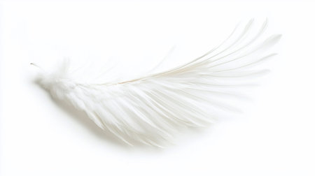 A single, soft white feather with intricate barbs and a subtle curve, captured in a close-up shot against a clean background, highlighting its ethereal beauty and lightness.