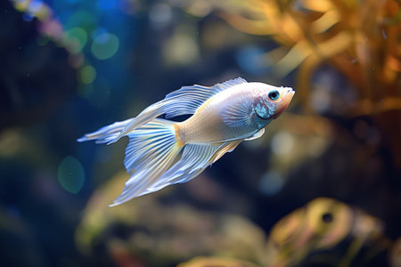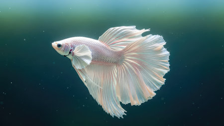 A graceful white Betta fish glides through the water, showcasing its flowing fins. The image features a shallow depth of field, with the fish in sharp focus against a soft, blurred background. The composition highlights the creature's delicate beauty, suitable for various editorial and commercial applications.