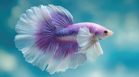 A close-up view presents a Betta fish with striking purple and white fins, complemented by a pale pink body. The fish appears to be suspended, with details highlighted by soft lighting. The composition creates a tranquil scene, suitable for various uses including decorative prints and educational materials.