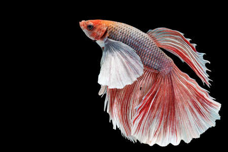 Halfmoon Betta splendens fighting fish in Thailand on isolated black background. The moving moment beautiful of red and white Siamese betta fish with copy space.