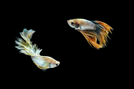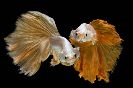 Capture the moving moment of yellow siamese fighting fish isolated on black background. betta fish.