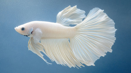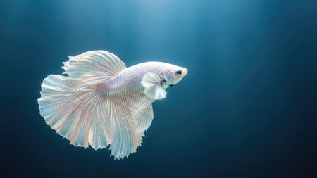 A graceful white betta fish is captured in a medium shot against a deep blue backdrop. The fish displays intricate fin details. The lighting creates highlights and shadows, emphasizing textures. This image may be useful for aquatic life articles, educational resources, or as a decorative element.