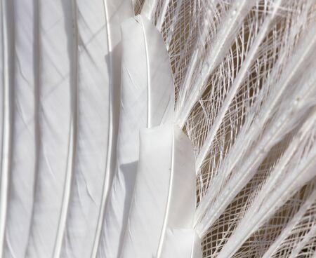 Closeup macro of white bird feather. Natural abstract texture forming monochromatic background.