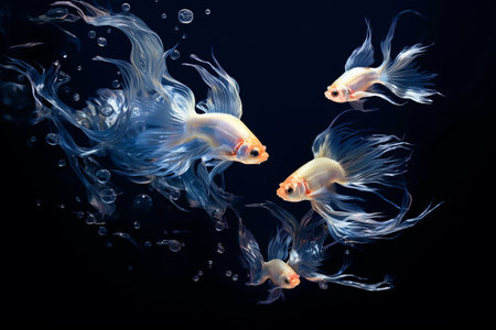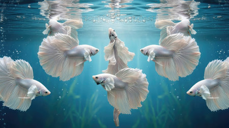 Several white betta fish are depicted gracefully swimming underwater. The image showcases a vibrant blue backdrop with bubbles, creating an aquatic atmosphere. The fish exhibit flowing fins and tails, and the lighting is diffused, producing a visually captivating composition suitable for diverse commercial applications.