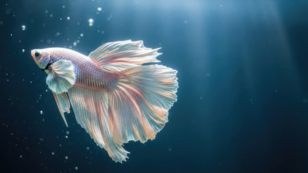 A graceful betta fish, predominantly white with hints of pink, is captured in a serene aquatic setting. The image highlights the fish's flowing fins against a gradient blue background. Sunlight streams from above, illuminating the water and the fish. Suitable for various editorial and commercial applications.