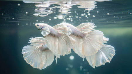 Two white Siamese fighting fish, also known as betta fish, are depicted gracefully against a dark backdrop. The image showcases the fish's intricate fins and delicate, translucent scales. The composition utilizes a balanced arrangement, enhanced by soft lighting. This versatile image suits various commercial applications, including decorative and educational purposes.