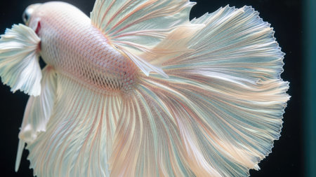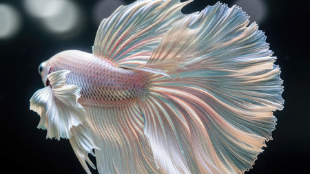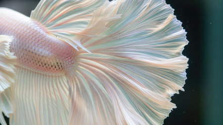 A close-up view displays a Betta fish with striking white and pastel hues. The intricate, flowing fins create a dynamic texture against a dark background. The image highlights the detailed patterns and forms, suitable for editorial and design projects. The lighting emphasizes the delicate structures and the aquatic environment.