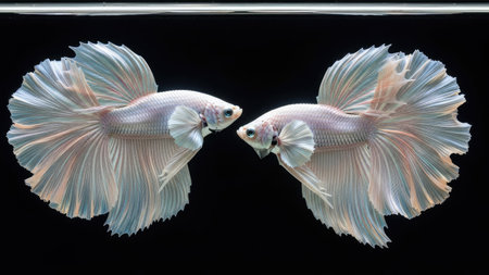 Two Siamese fighting fish are showcased in this image. They display delicate, flowing fins with white and subtle pink hues. The composition uses symmetry against a dark background, highlighting the aquatic creatures. This image is well-suited for various commercial and editorial projects.