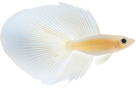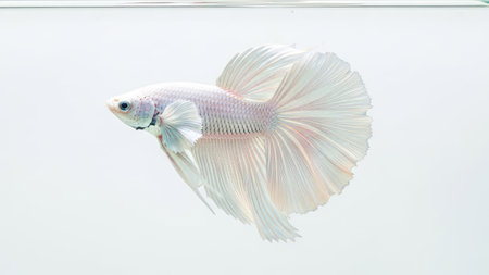 A pristine white Betta fish gracefully swims, isolated on a bright, uncluttered backdrop. The image showcases the fish's delicate fins and scales with detailed clarity. The lighting emphasizes the aquatic creature's form, suggesting potential applications for nature-themed projects or decorative elements. The composition suggests suitability for various commercial and editorial uses.