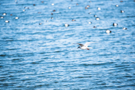 White-cheeked Tern fishing in Danube Delta, Romania. Tern in flight over water at sunrise