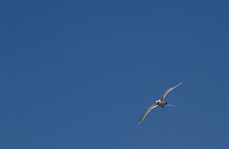 A sandwich tern in flight blue sky, sunny day in summer, northern France