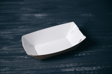 Concept of street food. Disposable paper utensils. Copy space, selective focus. On wood background
