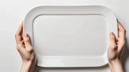 A clean and minimalist composition featuring two hands gently holding a plain white plate against a bright, neutral background. Perfect for concepts related to food, dining, minimalism, or tableware. Ideal for use in advertising, blogs, or editorial content