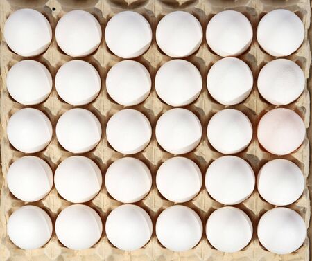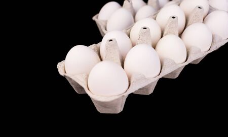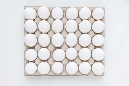 Fresh raw 30 pack of large white eggs in cardboard on white background. Consumerism, egg production, organic healthy bio product and Easter holiday concept. Top view of thirty eggs, copy space