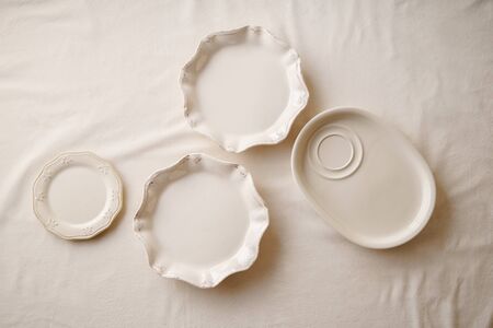 Porcelain plates on linen tablecloth. Overhead image, copy space. Natural materials concept.