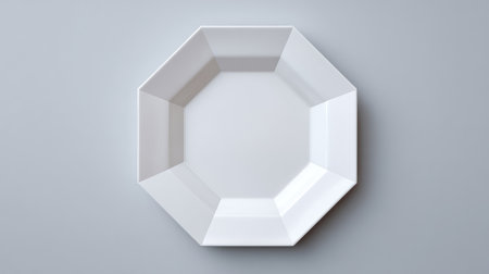 A stunning octagonal white plate rests on a smooth gray background, perfect for showcasing culinary creations or for elegant dining presentations, emphasizing simplicity and style.