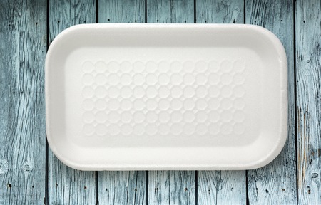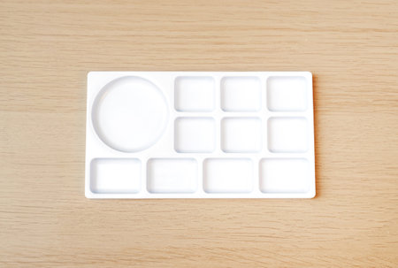 White watercolor palette. Empty watercolor tray isolated on wood background. White plastic paint palette.