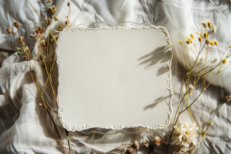 Blank sheet of paper on white fabric with dried flowers. Flat lay.