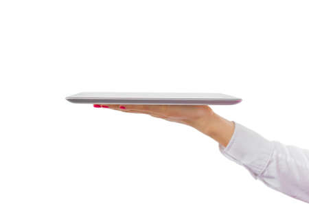 The waiter's hand in white gloves holds a silver tray. Isolate on a light background